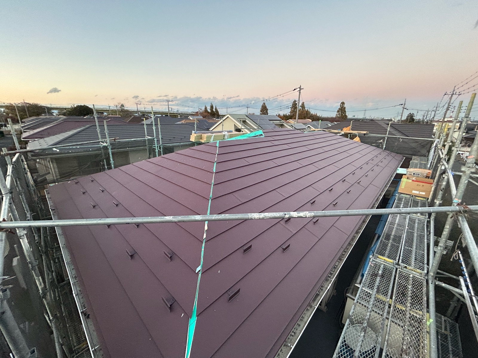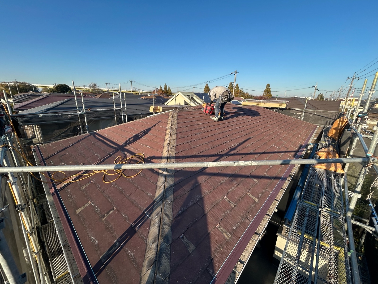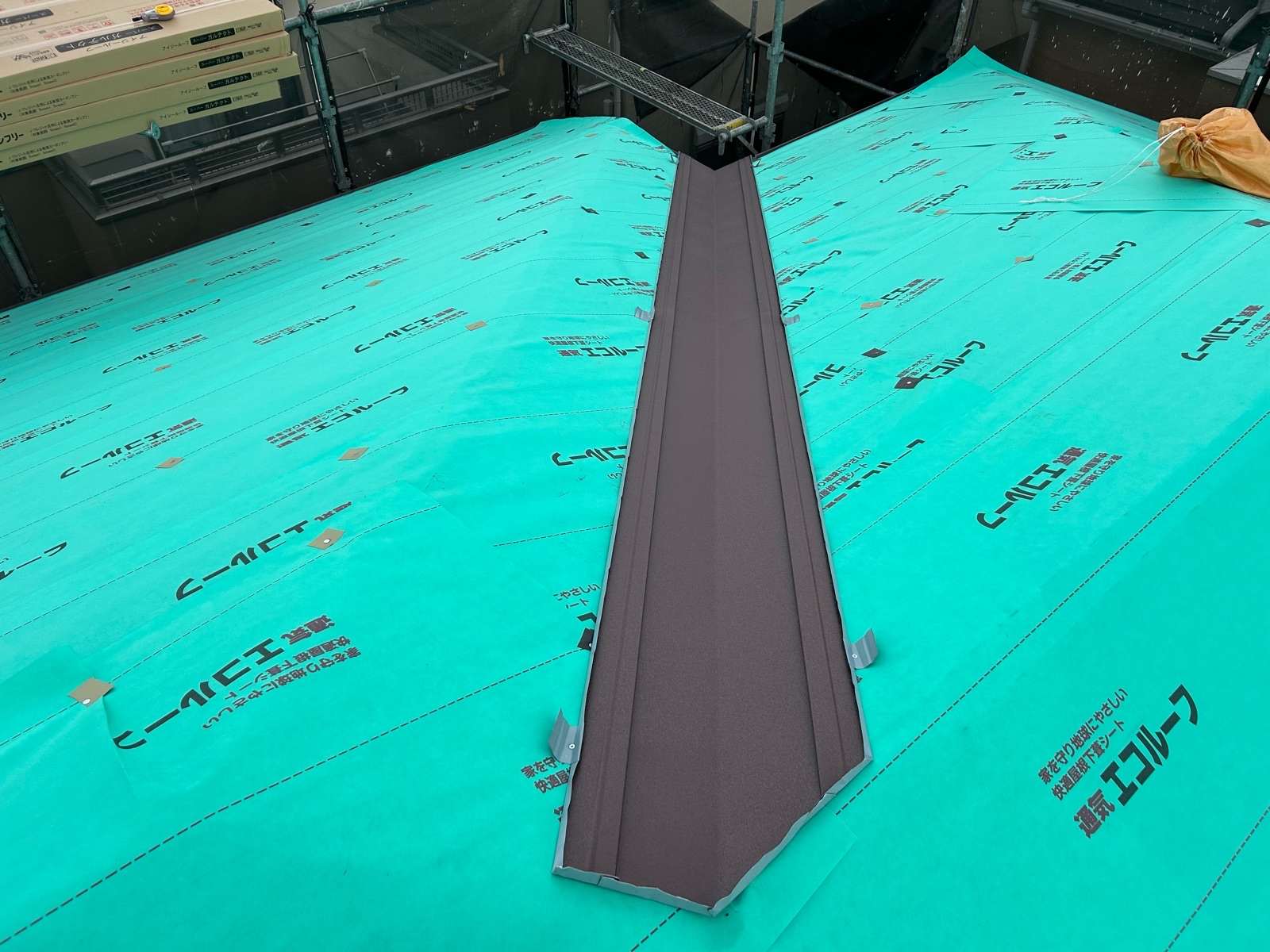 既存の屋根材を撤去し、下地の状態を確認した後、防水シート(ルーフィング)を施工。